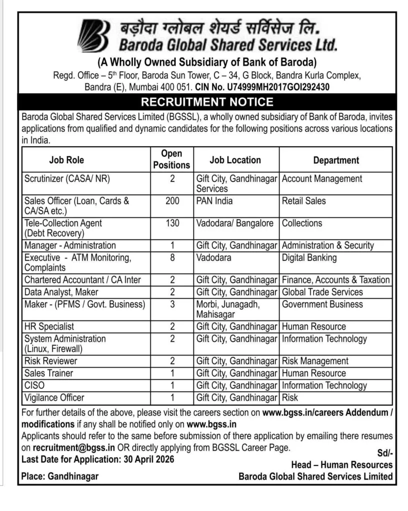 Baroda Global Shared Services Ltd (BGSSL), a wholly-owned subsidiary of Bank of Baroda, has announced a major recruitment drive for 2026. With over 350+ vacancies available across India, this is an excellent opportunity for job seekers looking to build a career in the banking and financial services sector.